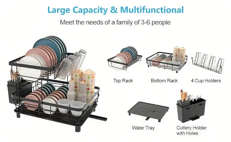 Un soporte para utensilios, un soporte para tazas y platos, un soporte de almacenamiento para cocina, un soporte comercial para utensilios, un soporte de platos de doble capa con tablero de drenaje, con soporte para utensilios y portavasos, negro.