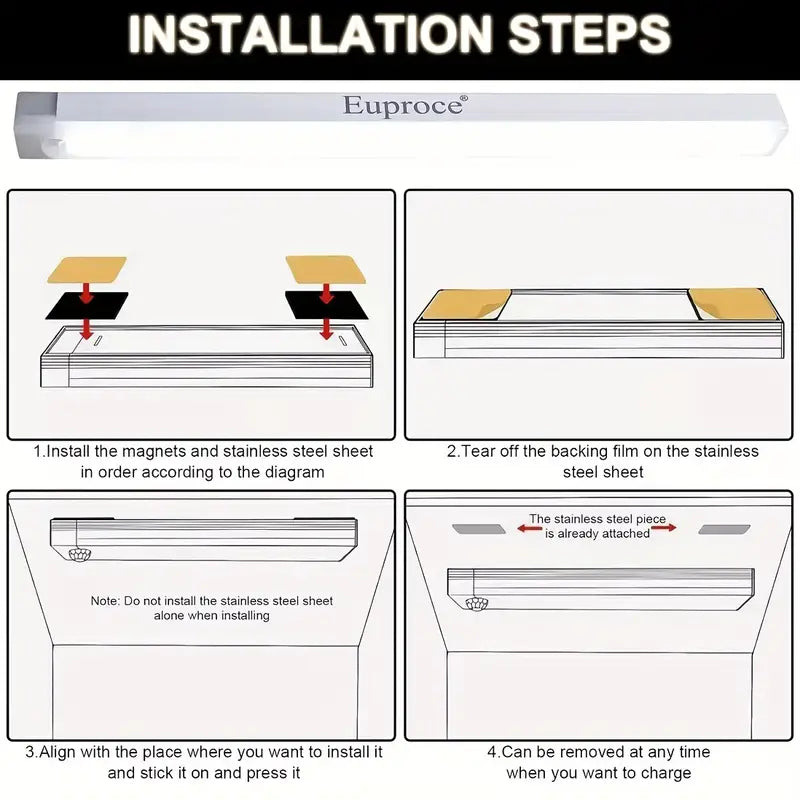 3: Recargable: se puede utilizar durante mucho tiempo con una sola carga. El método de fijación es magnético. Retire el adhesivo en la parte posterior del imán del paquete y péguelo en la pared o gabinete. La luz de inducción se puede fijar al imán.
